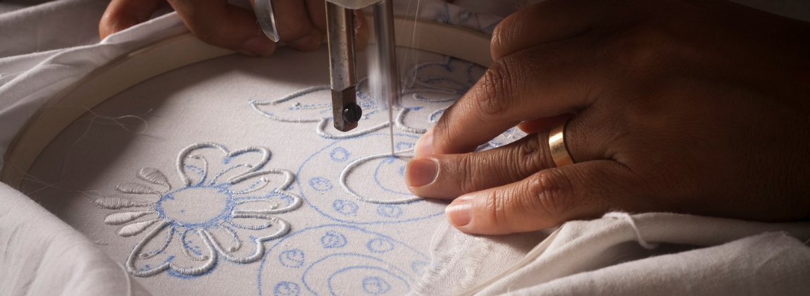 Produto: Bordado de Caicó. Realizado à mão, à máquina de pedal e à máquina a motor. Linhas e fios de 100% algodão ou seda, em tecidos específicos. Mais de 100 tipos de pontos catalogados — ponto cheio, Richelieu, matiz, rococó, crivo e granito. Não é permitido uso de equipamentos computadorizados.